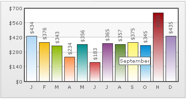 <chart numberPrefix='$' rotateValues='1'> <set label='J' toolText='January' value='434' /> <set label='F' toolText='February' value='376' /> <set label='M' toolText='March' value='343' /> <set label='A' toolText='April' value='234' /> <set label='M' toolText='May' value='356' /> <set label='J' toolText='June' value='183' /> <set label='J' toolText='July' value='365' /> <set label='A' toolText='August' value='357' /> <set label='S' toolText='September' value='375' /> <set label='O' toolText='October' value='345' /> <set label='N' toolText='November' value='655' /> <set label='D' toolText='December' value='435' /> </chart> {